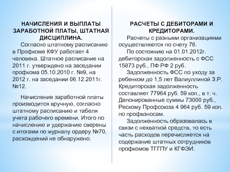 Задолженность ФСС по уходу за ребенком до 1,5 лет Валиуллиной З.Р. Кредиторская задолженность составляет 77964 руб. 59 коп., в т. ч. Депонированные суммы 73000 руб., Рескому Профсоюза 4 964 руб. 59 коп. по профвзносам.