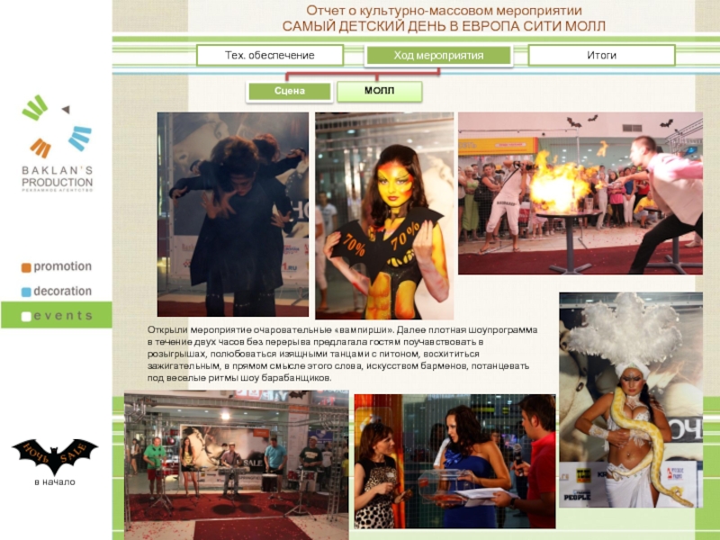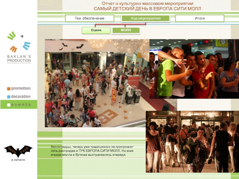 В качестве основной темы декораций были выбраны летучие мыши из черного пластика с оранжевыми надписями «Ночь SALE»