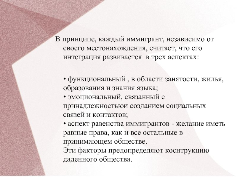 • аспект равенства иммигрантов - желание иметь равные права, как и все остальные в принимающем обществе.