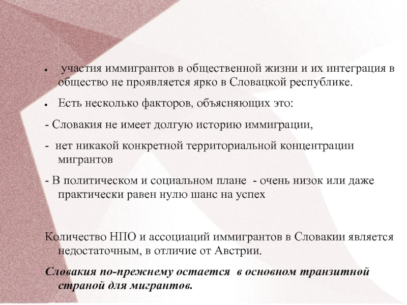 Количество НПО и ассоциаций иммигрантов в Словакии является недостаточным, в отличие от Австрии.