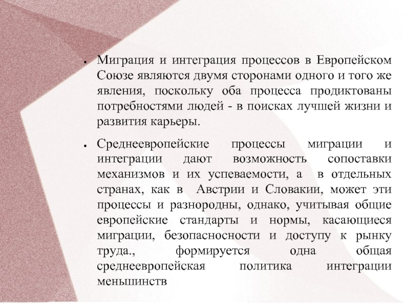 Среднеевропейские процессы миграции и интеграции дают возможность сопоставки механизмов и их успеваемости, а в отдельных странах, как в Австрии и Словакии, может эти процессы и разнородны, однако, учитывая общие европейские стандарты и нормы, касающиеся миграции, безопасносности и доступу к рынку труда., формируется одна общая среднеевропейская политика интеграции меньшинств