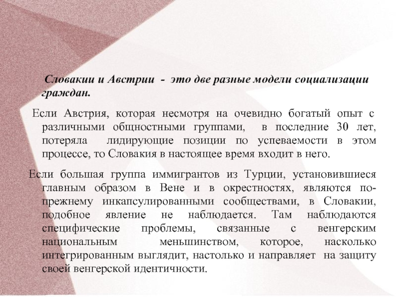 Если большая группа иммигрантов из Турции, установившиеся главным образом в Вене и в окрестностях, являются по-прежнему инкапсулированными сообществами, в Словакии, подобное явление не наблюдается. Там наблюдаются специфические проблемы, связанные с венгерским национальным меньшинством, которое, насколько интегрированным выглядит, настолько и направляет на защиту своей венгерской идентичности.