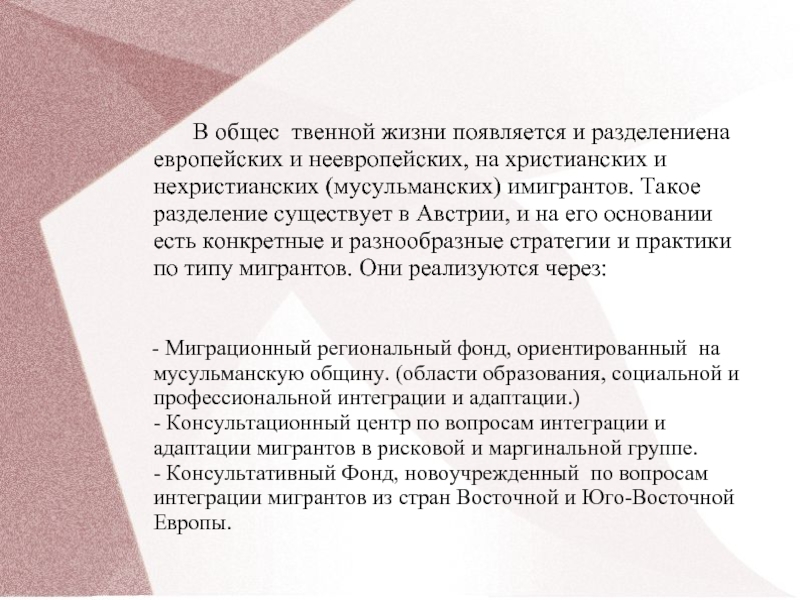 и разделениена европейских и неевропейских, на христианских и нехристианских (мусульманских) имигрантов. Такое разделение существует в Австрии, и на его основании есть конкретные и разнообразные стратегии и практики по типу мигрантов. Они реализуются через: