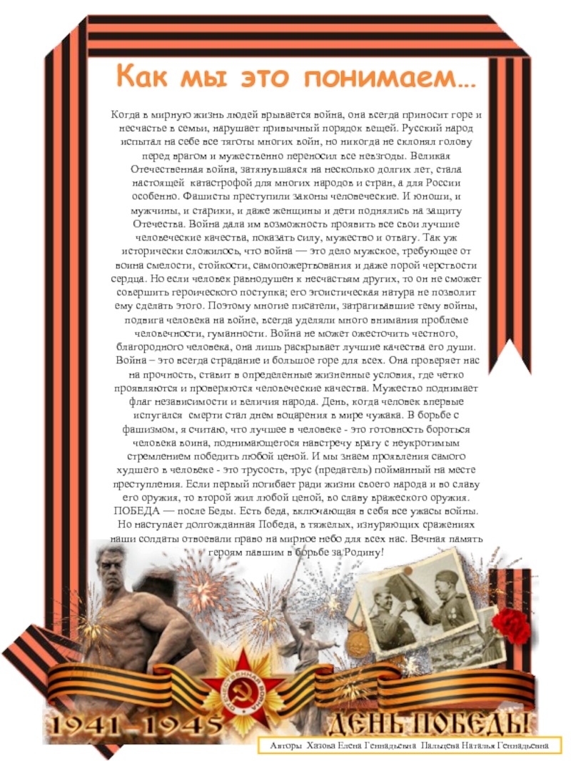 В нашем дошкольном учреждении уделяется большое внимание патриотическому воспитанию дошкольников. Педагоги знакомят дошколят с событиями минувших лет, рассказывают о подвигах солдат , о страданиях взрослых и детей, прошедших войну, показывают хроники военных лет и презентации, организуют досуги и экскурсии. Педагоги с большим вдохновением и трепетом участвовали в составлении газеты «Они с нами рядом,..» посвященной празднованию 70 –тилетия со дня Победы. Мы всегда будем помнить, какой ценой далась нам Победа. В России нет семьи, которую не опалило бы огненное дыхание смертельных боёв, которая без потерь и лишений прожила те суровые годы. Мы в неоплатном долгу перед ветеранами, тружениками тыла, всеми, кто вынес на своих плечах все тяготы войны, проявив массовый героизм, мужество, беззаветную любовь к Родине. Самоотверженное служение Отчизне будет вечно служить ярким примером для всех последующих поколений граждан нашей страны.