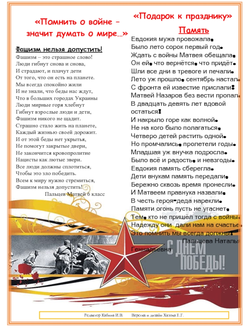 Всё дальше в историю уходят годы самой жестокой войны двадцатого столетия – Великой отечественной войны 1941-1945 г.г., но не меркнет величие подвига, совершенного нашим народом.
