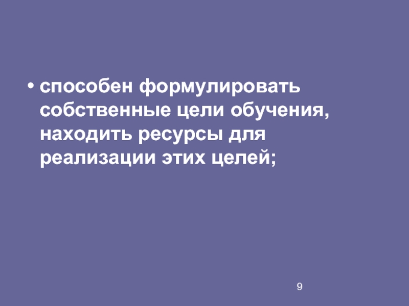 способен формулировать собственные цели обучения, находить ресурсы для реализации этих целей;