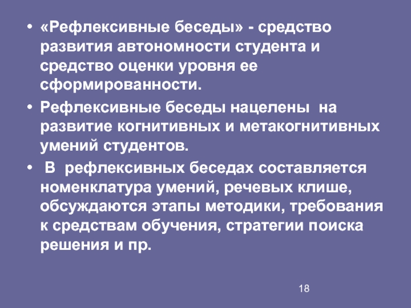 Рефлексивные беседы нацелены на развитие когнитивных и метакогнитивных умений студентов.