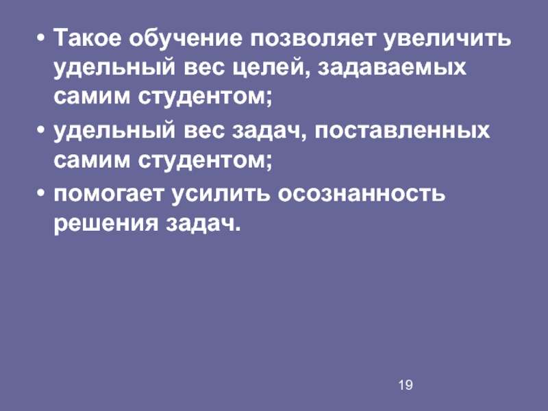 Такое обучение позволяет увеличить удельный вес целей, задаваемых самим студентом;