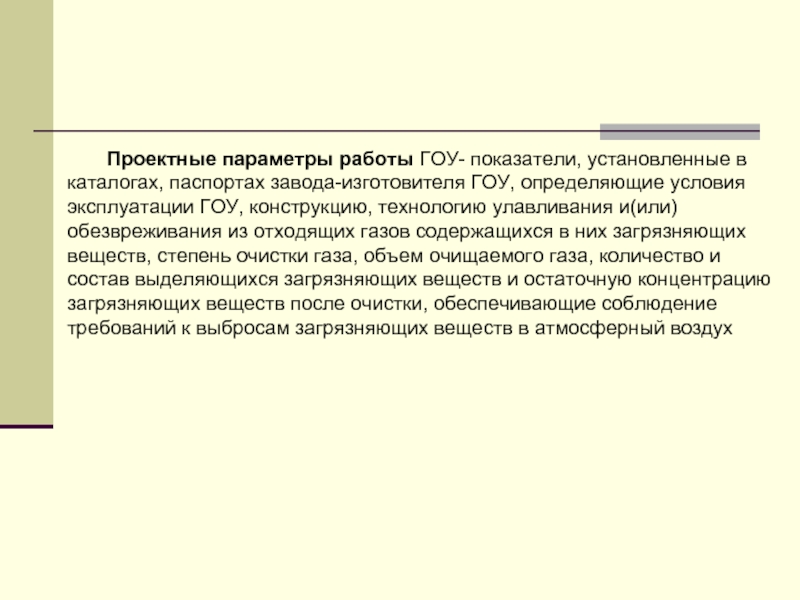 Неэффективная ГОУ – установка, не обеспечивающая в исправном состоянии очистку газа от загрязняющих веществ или их обезвреживание до концентраций, установленных техническими нормативными правовыми актами, проектными решениями или не соответствующая проектным решениям по объему очищаемого газа