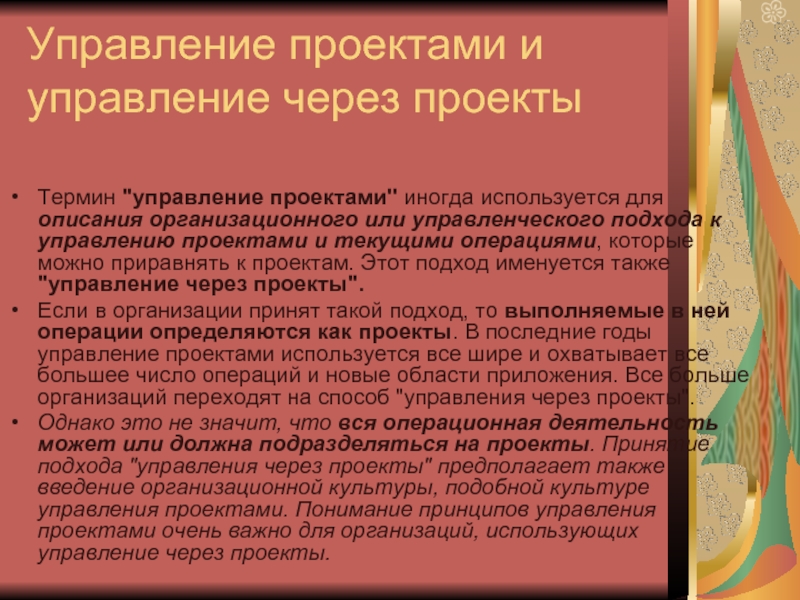 описания организационного или управленческого подхода к управлению проектами и текущими операциями, которые можно приравнять к проектам. Этот подход именуется также "управление через проекты".