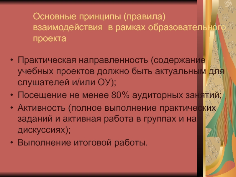 Слайд 26Основные принципы (правила) взаимодействия в рамках образовательного проекта