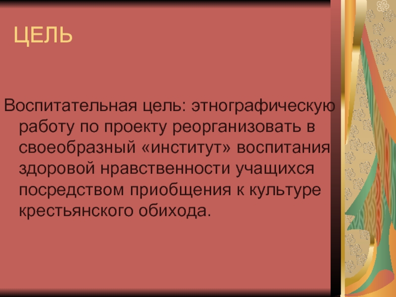 Воспитательная цель: этнографическую работу по проекту реорганизовать в своеобразный «институт»