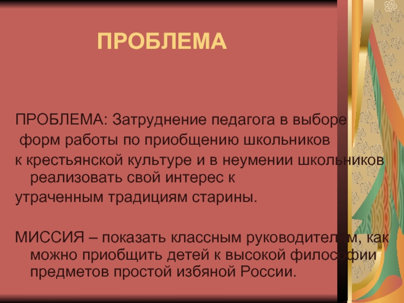 МИССИЯ – показать классным руководителям, как можно приобщить детей к высокой философии предметов простой избяной России.