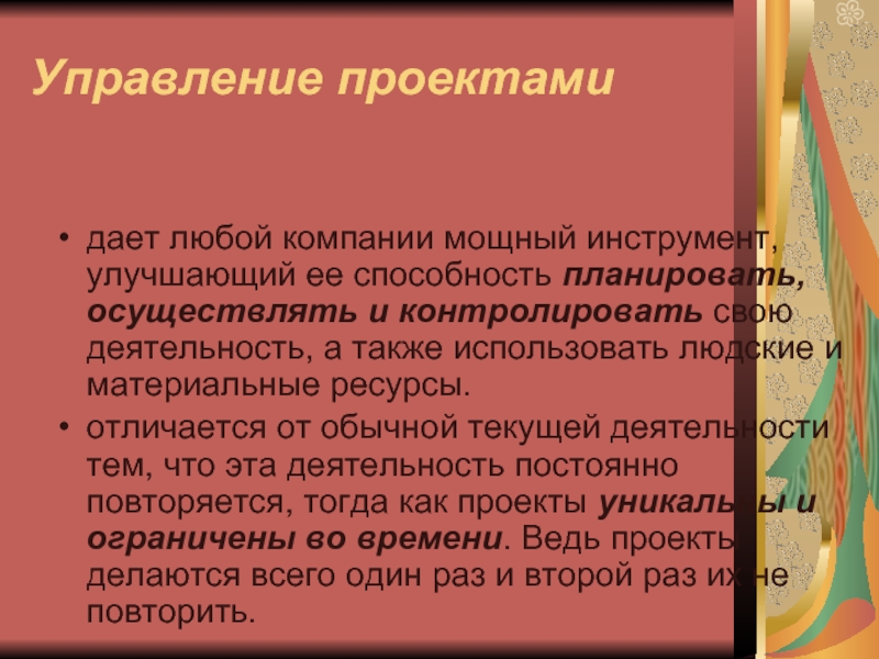 отличается от обычной текущей деятельности тем, что эта деятельность постоянно повторяется, тогда как проекты уникальны и ограничены во времени. Ведь проекты делаются всего один раз и второй раз их не повторить.