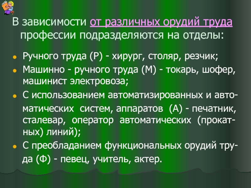 В зависимости от различных орудий труда профессии подразделяются на отделы: