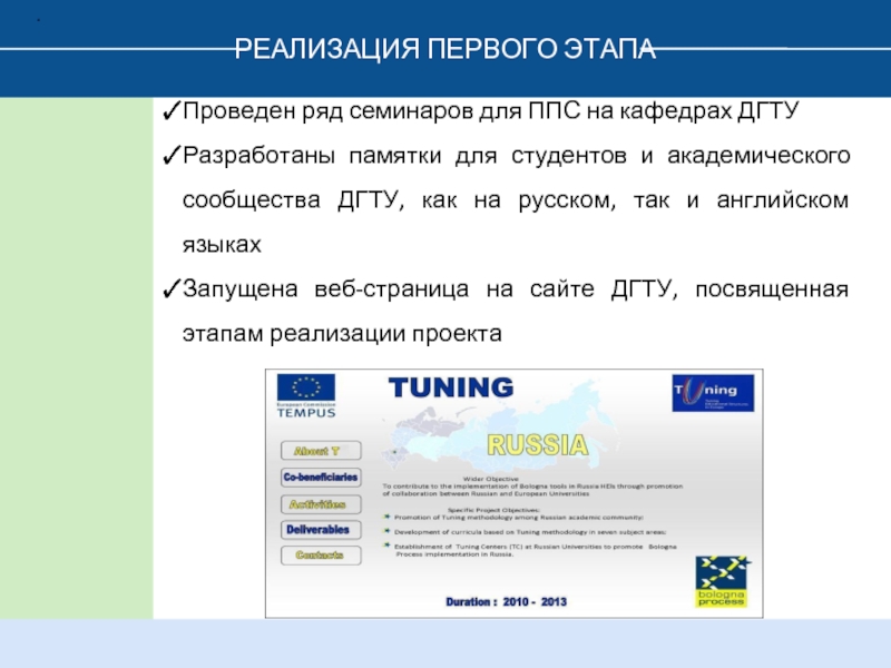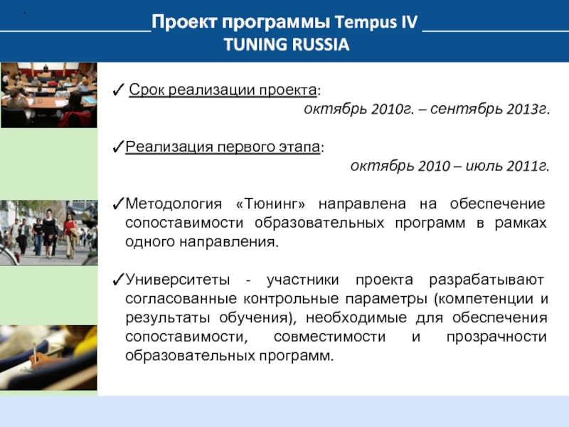 2. Внедрение и развитие методологии Тюнинг в российских университетах, открытие центров на базе университетов – участников проекта, создание информационно-методической базы и экспертной сети для дальнейшего продвижения компетентностно-ориентированных методик в систему высшего профессионального образования России.