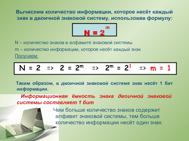 N = 2 => 2 = 2m => 2m = 21 => m = 1