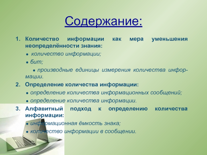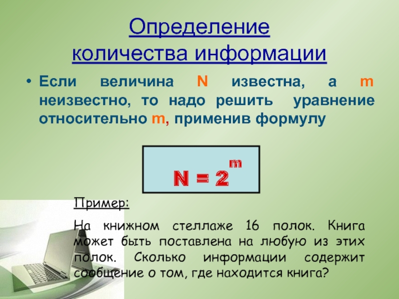 Если некоторое сообщение приводит к уменьшению неопределённости нашего знания, то можно говорить, что такое сообщение содержит информацию.