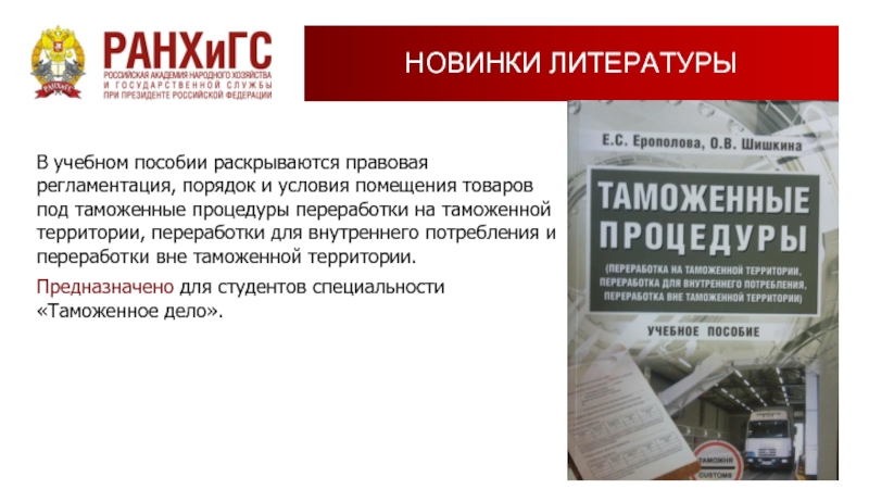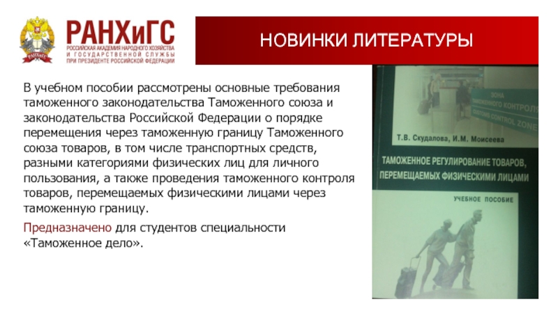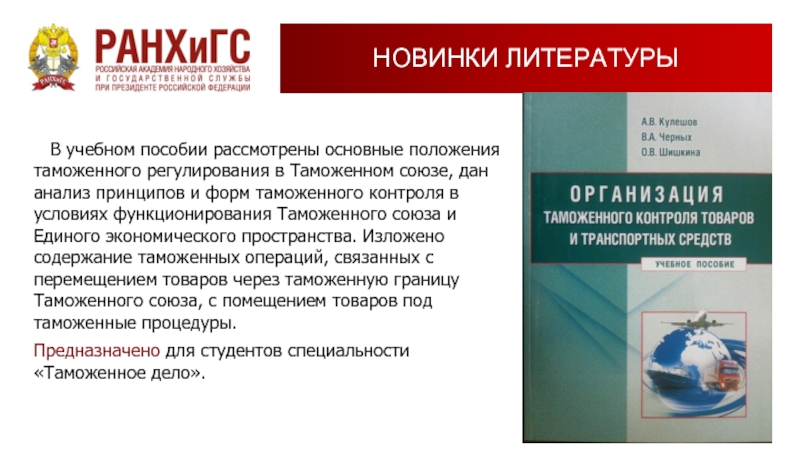 таможенного регулирования в Таможенном союзе, дан анализ принципов и форм таможенного контроля в условиях функционирования Таможенного союза и Единого экономического пространства. Изложено содержание таможенных операций, связанных с перемещением товаров через таможенную границу Таможенного союза, с помещением товаров под таможенные процедуры.