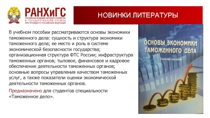 структура экономики таможенного дела; ее место и роль в системе экономической безопасности государства; организационная структура ФТС России; инфраструктура таможенных органов; тыловое, финансовое и кадровое обеспечение деятельности таможенных органов; основные вопросы управления качеством таможенных услуг, а также показатели оценки экономической деятельности таможенных органов.