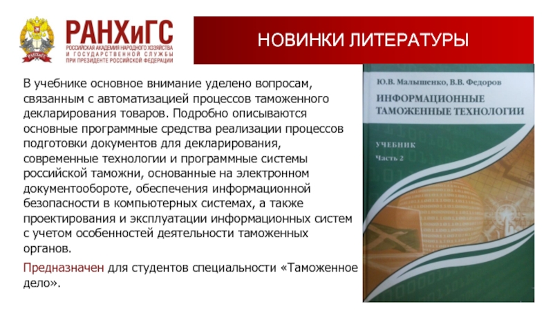 таможенного декларирования товаров. Подробно описываются основные программные средства реализации процессов подготовки документов для декларирования, современные технологии и программные системы российской таможни, основанные на электронном документообороте, обеспечения информационной безопасности в компьютерных системах, а также проектирования и эксплуатации информационных систем с учетом особенностей деятельности таможенных органов.