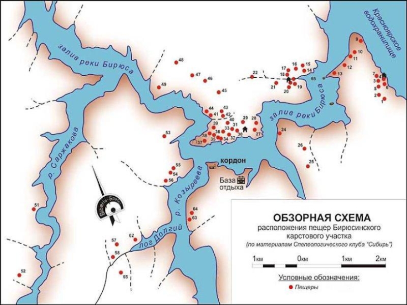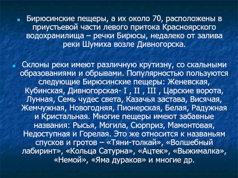 Слайд 14Бирюсинские пещеры, а их около 70, расположены в приустьевой части левого