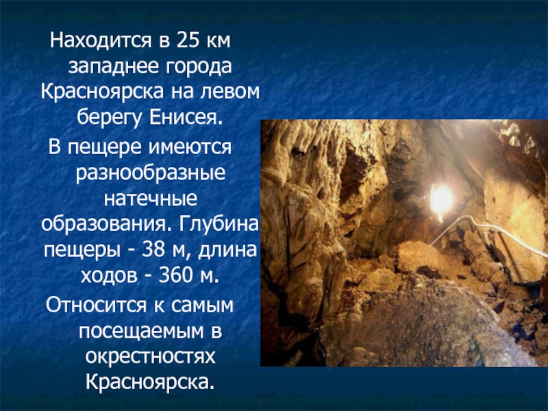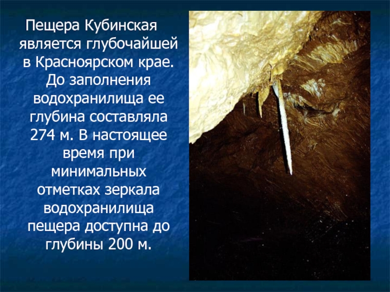 Слайд 8Пещера Кубинская является глубочайшей в Красноярском крае. До заполнения водохранилища ее