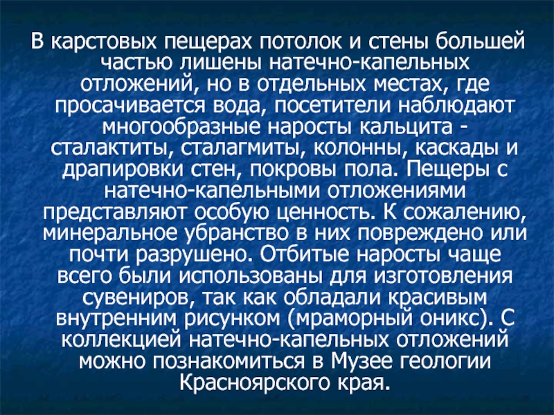 отложений, но в отдельных местах, где просачивается вода, посетители наблюдают многообразные наросты кальцита - сталактиты, сталагмиты, колонны, каскады и драпировки стен, покровы пола. Пещеры с натечно-капельными отложениями представляют особую ценность. К сожалению, минеральное убранство в них повреждено или почти разрушено. Отбитые наросты чаще всего были использованы для изготовления сувениров, так как обладали красивым внутренним рисунком (мраморный оникс). С коллекцией натечно-капельных отложений можно познакомиться в Музее геологии Красноярского края.