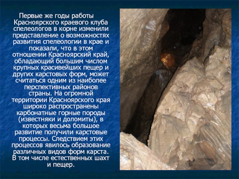 представление о возможностях развития спелеологии в крае и показали, что в этом отношении Красноярский край, обладающий большим числом крупных красивейших пещер и других карстовых форм, может считаться одним из наиболее перспективных районов страны. На огромной территории Красноярского края широко распространены карбонатные горные породы (известняки и доломиты), в которых весьма большое развитие получили карстовые процессы. Следствием этих процессов явилось образование различных видов форм карста. В том числе естественных шахт и пещер.