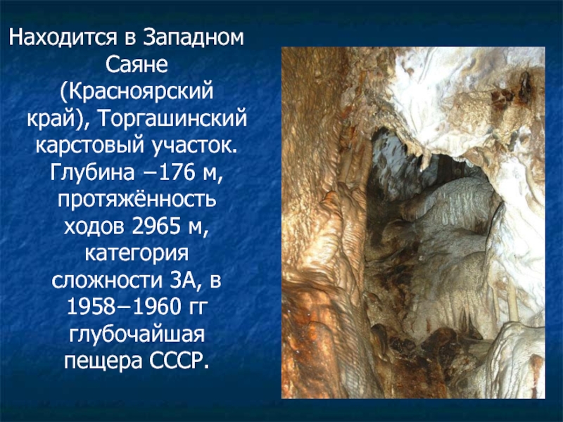 Слайд 12Находится в Западном Саяне (Красноярский край), Торгашинский карстовый участок. Глубина −176