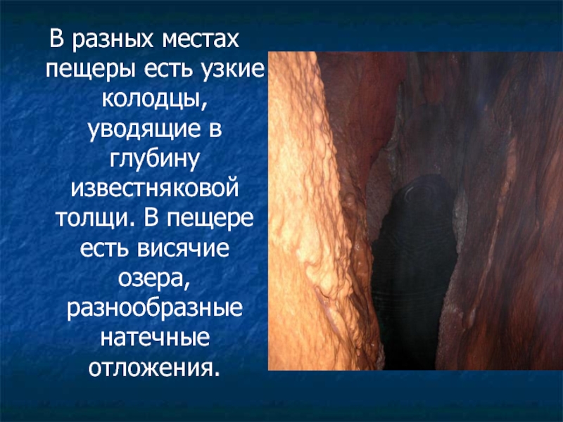 Слайд 13В разных местах пещеры есть узкие колодцы, уводящие в глубину известняковой