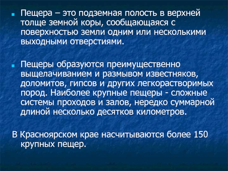 Слайд 2Пещера – это подземная полость в верхней толще земной коры, сообщающаяся
