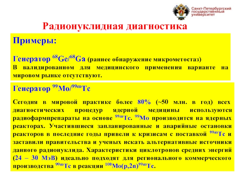 Сегодня в мировой практике более 80% (~50 млн. в год) всех диагностических процедур ядерной медицины используются радиофармпрепараты на основе 99mTc. 99Mo производится на ядерных реакторах. Участившиеся запланированные и аварийные остановки реакторов в последние годы привели к кризисам с поставкой 99mTc и заставили правительства и ученых искать альтернативные источники данного радионуклида. Характеристики циклотронов средних энергий (24 – 30 МэВ) идеально подходят для регионального коммерческого производства 99mTc в реакции 100Mo(p,2n)99mTc.