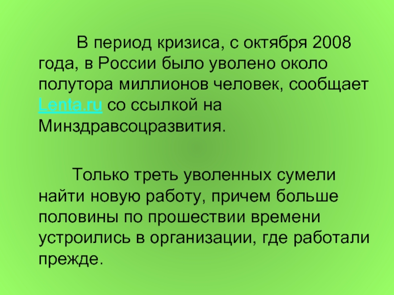 2008 года, в России было уволено около полутора миллионов человек, сообщает Lenta.ru со ссылкой на Минздравсоцразвития.