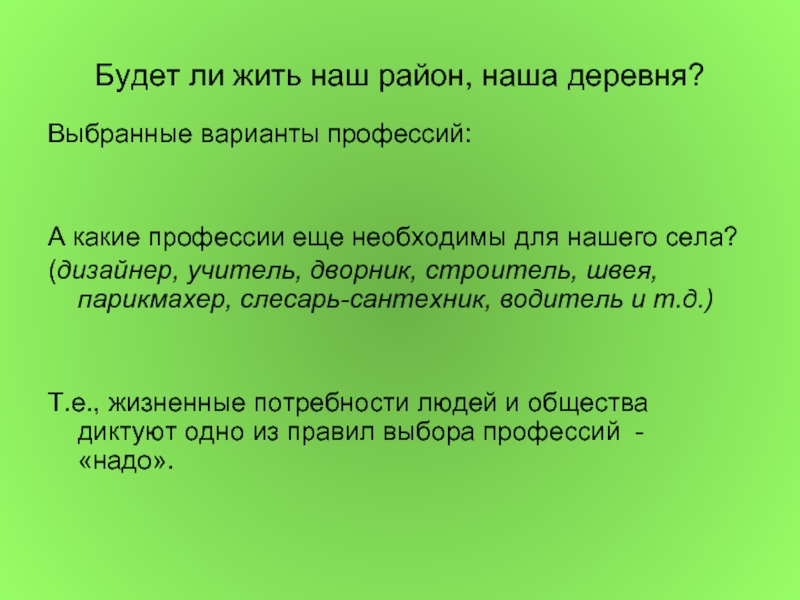 Т.е., жизненные потребности людей и общества диктуют одно из правил выбора профессий - «надо».