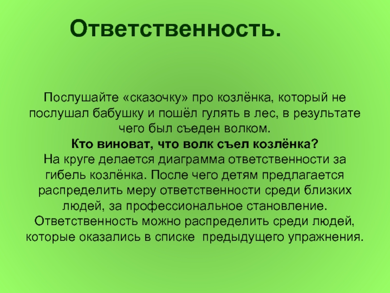 На круге делается диаграмма ответственности за гибель козлёнка. После чего детям предлагается распределить меру ответственности среди близких людей, за профессиональное становление.
