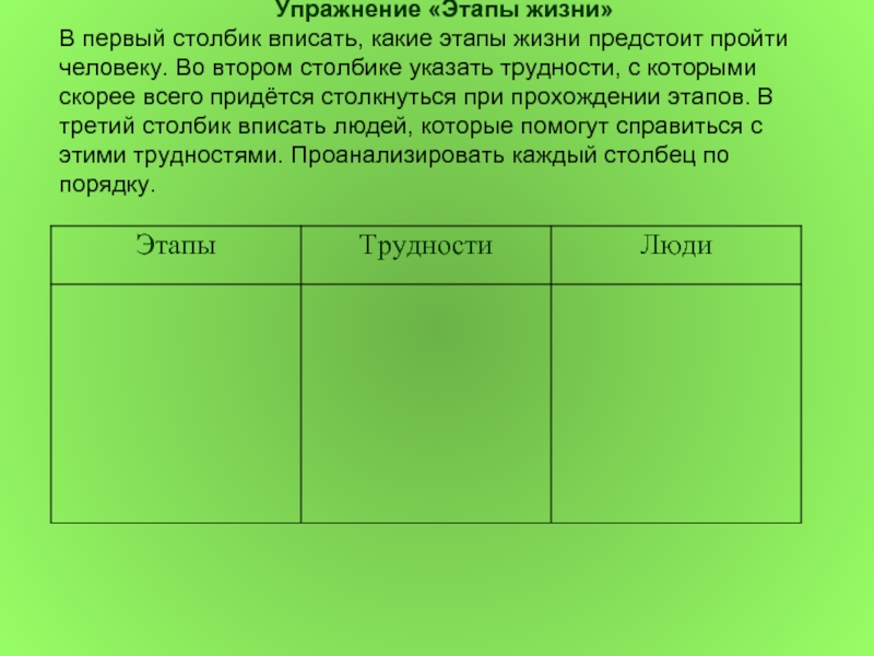 человеку. Во втором столбике указать трудности, с которыми скорее всего придётся столкнуться при прохождении этапов. В третий столбик вписать людей, которые помогут справиться с этими трудностями. Проанализировать каждый столбец по порядку.