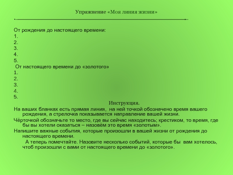 Чёрточкой обозначьте то место, где вы сейчас находитесь; крестиком, то время, где бы вы хотели оказаться – назовём это время «золотым».