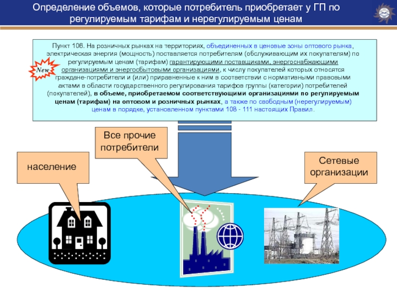 Пункт 106. На розничных рынках на территориях, объединенных в ценовые зоны оптового рынка, электрическая энергия (мощность) поставляется потребителям (обслуживающим их покупателям) по регулируемым ценам (тарифам) гарантирующими поставщиками, энергоснабжающими организациями и энергосбытовыми организациями, к числу покупателей которых относятся граждане-потребители и (или) приравненные к ним в соответствии с нормативными правовыми актами в области государственного регулирования тарифов группы (категории) потребителей (покупателей), в объеме, приобретаемом соответствующими организациями по регулируемым ценам (тарифам) на оптовом и розничных рынках, а также по свободным (нерегулируемым) ценам в порядке, установленном пунктами 108 - 111 настоящих Правил.