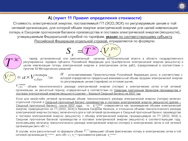 Объем электрической энергии, поставляемый ГП (ЭСО,ЭСК) по регулируемым ценам s-той сетевой организации, для которой объем покупки электрической энергии для целей компенсации потерь в Сводном прогнозном балансе производства и поставок электрической энергии (мощности), утверждаемым Федеральной службой по тарифам, указан по соответствующему субъекту Российской Федерации отдельной строкой, и определяется согласно формулы: