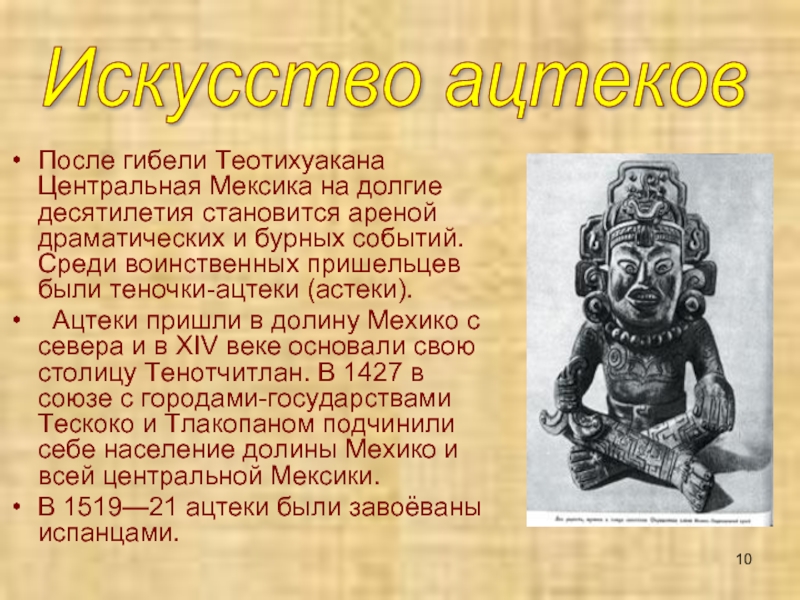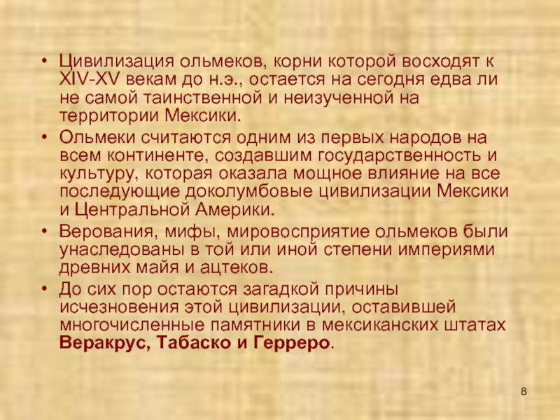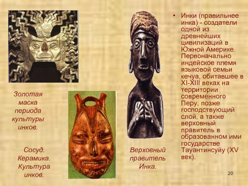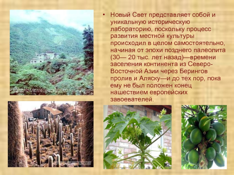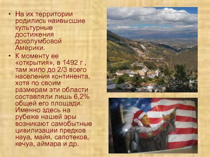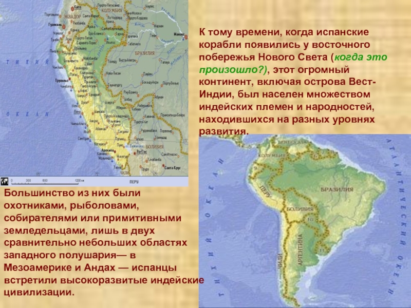 Большинство из них были охотниками, рыболовами, собирателями или примитивными земледельцами, лишь в двух сравнительно небольших областях западного полушария— в Мезоамерике и Андах — испанцы встретили высокоразвитые индейские цивилизации.