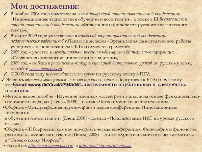 2009 год – участие в международной российско-болгарской Интернет-конференции «Славянская филология: инновации и традиции»;