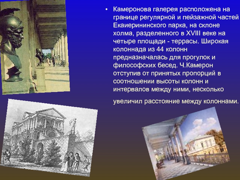 на склоне холма, разделенного в XVIII веке на четыре площади - террасы. Широкая колоннада из 44 колонн предназначалась для прогулок и философских бесед. Ч.Камерон отступив от принятых пропорций в соотношении высоты колонн и интервалов между ними, несколько увеличил расстояние между колоннами.