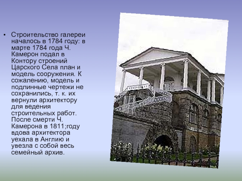 Строительство галереи началось в 1784 году: в марте 1784 года Ч. Камерон подал