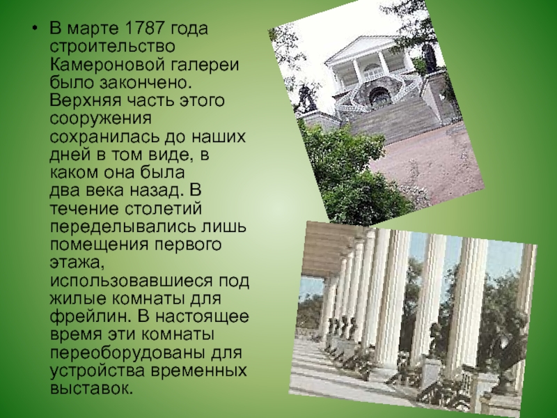 В марте 1787 года строительство Камероновой галереи было закончено. Верхняя часть этого