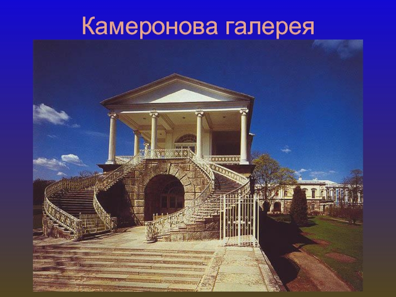 Камеронова галерея расположена на границе регулярной и пейзажной частей Екаиерининского парка,