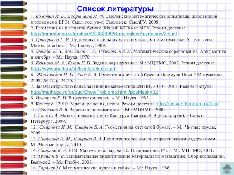 Площади многоугольников, вершины которых расположены в узлах сетки, можно вычислять гораздо проще: обозначим через В количество узлов, лежащих внутри многоугольника, а через Г – количество узлов на его границе.