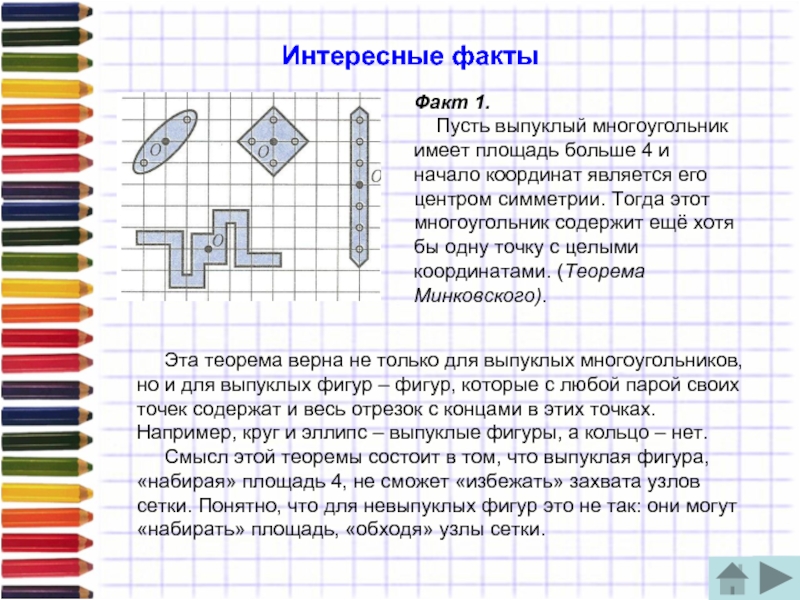 Смысл этой теоремы состоит в том, что выпуклая фигура, «набирая» площадь 4, не сможет «избежать» захвата узлов сетки. Понятно, что для невыпуклых фигур это не так: они могут «набирать» площадь, «обходя» узлы сетки.