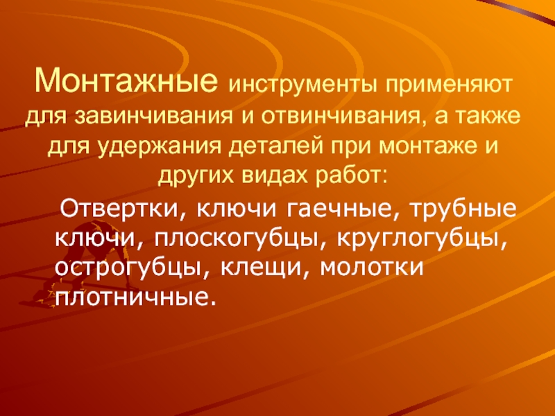 Слайд 23Монтажные инструменты применяют для завинчивания и отвинчивания, а также для удержания