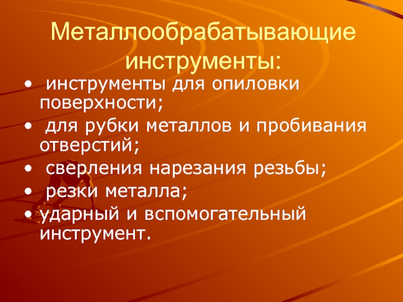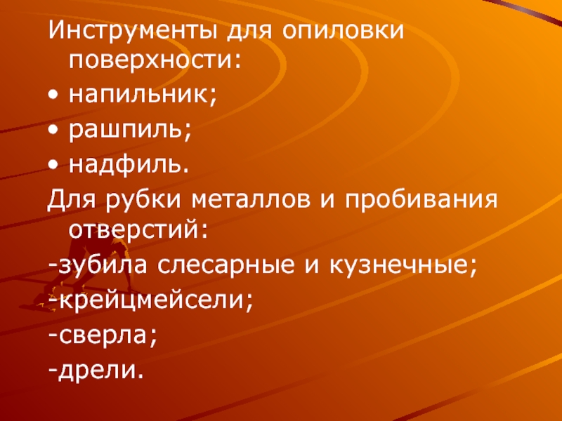 Для штукатурных, каменных и других строительных работ выпускают кельмы, дюбели, шлямбуры, пробойники, резцы по дереву и линолеуму, уровни и др.